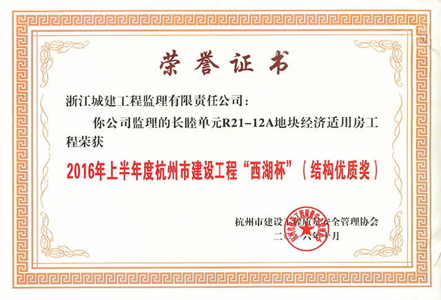 2016年上半年度长睦单元R21-12A地块经济适用房工程荣获杭州市建设工程“西湖杯”(结构优质奖)