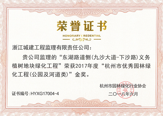 2017年东湖路道侧(九沙大道-下沙路)义务植树地块绿化工程荣获杭州市优秀园林绿化工程(公园及河道类)金奖
