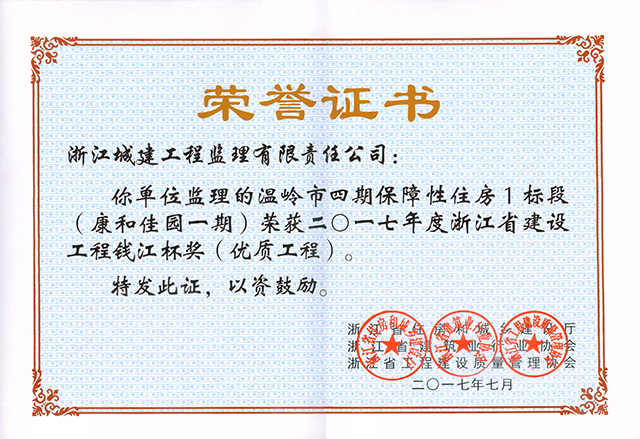 2017年温岭市四期保障性住房1标段(康和佳园一期)荣获浙江省建设工程钱江杯(优质工程)