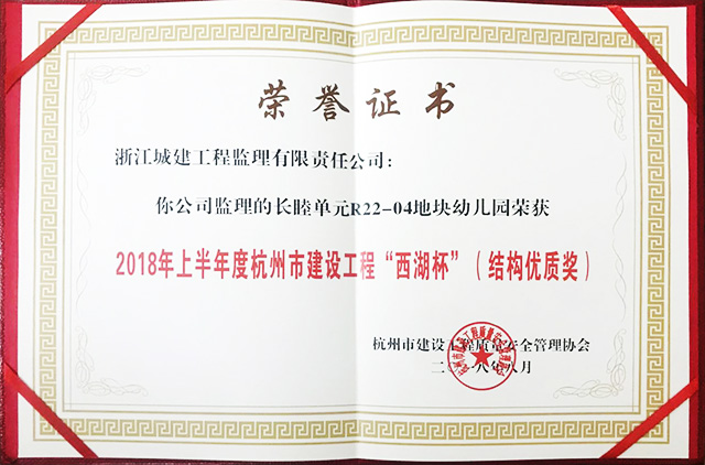 2018年上半年度长睦单元R22-04地块幼儿园荣获杭州市建设工程“西湖杯”(结构优质奖)