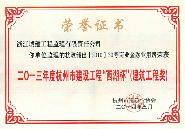 2013年杭政储出【2010】30号商业金融业用房荣获杭州市建设工程“西湖杯”(建筑工程奖)