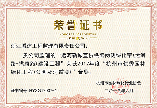 2017年运河新城宣杭铁路两侧绿化带(运河路-拱康路)建设工程荣获杭州市优秀园林绿化工程(公园及河道)金奖