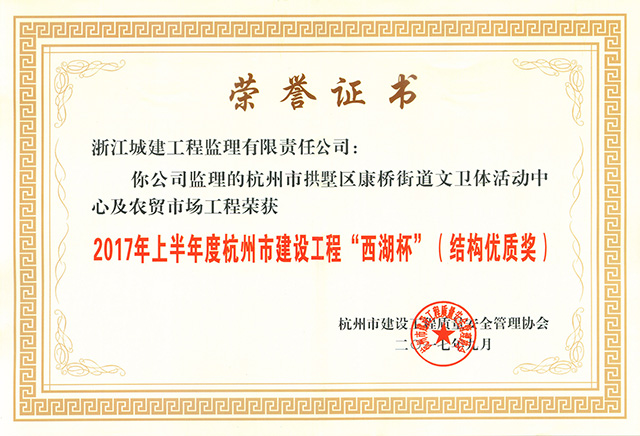 2017年上半年度杭州市拱墅区康桥街道文卫体活动中心及农贸市场工程荣获杭州市建设工程”西湖杯“(结构优质奖)