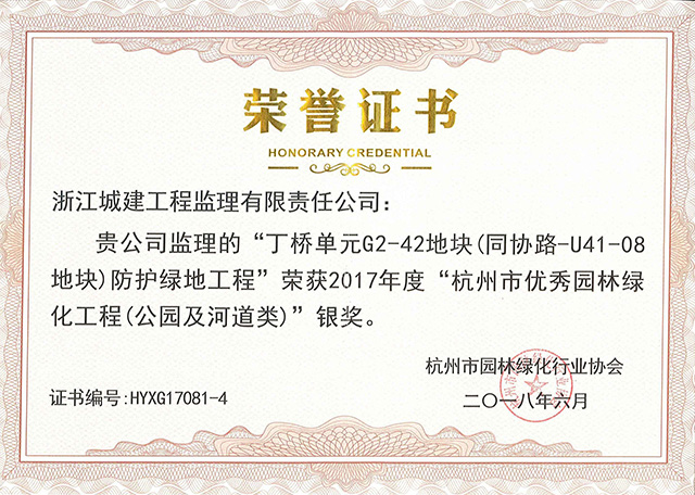 2017年丁桥单元G2-42地块(同协路-U41-08地块)防护绿化工程荣获杭州市优秀园林绿化工程(公园及河道类)银奖