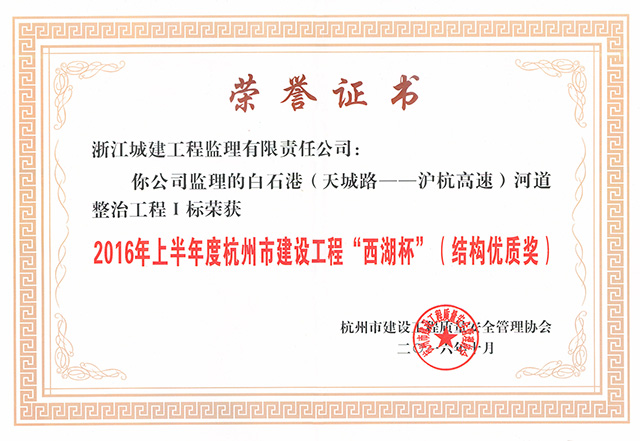 2016年上半年度白石港(天城路-沪杭高速)河道整治工程Ⅰ标荣获杭州市建设工程“西湖杯”(结构优质奖)
