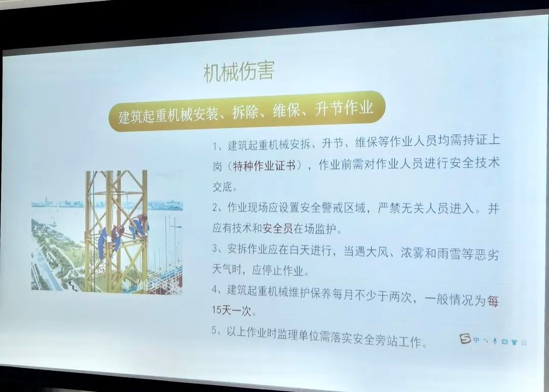 其次由工程部汇报安全月专项检查过程中发现的各个项目中存在的安全问题,各项目负责人对项目的安全问题整改情况进行汇报;监理事业部总经理黄总通过案例分析、现场图片展示等方式,从高处坠落、物体打击等8个方面讲解各类安全问题的隐患特点、成因分析以及监理对现场安全的管控要求。